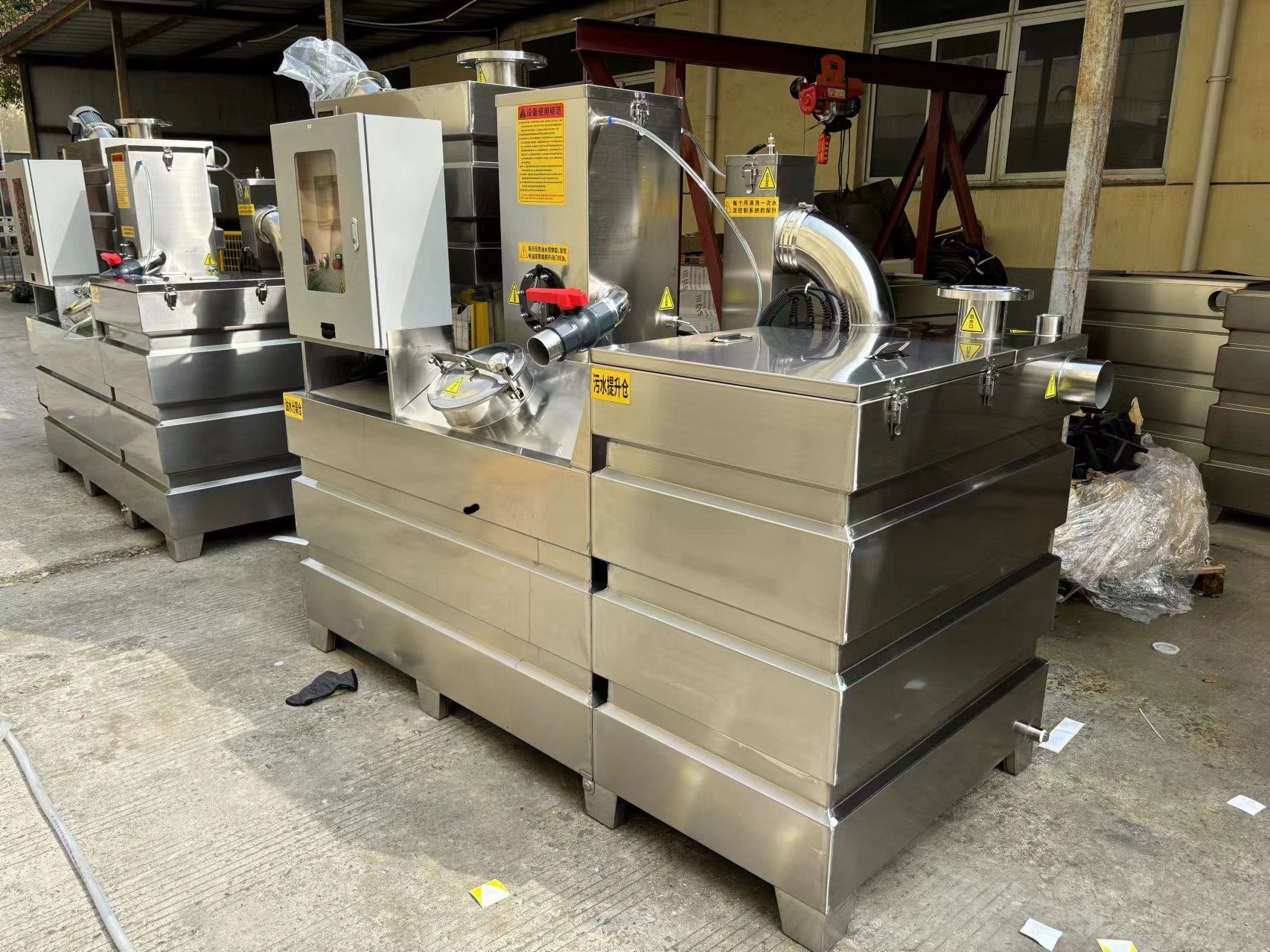 油污水總管連接到設備污水進口,污水首先進入渣液分離倉,污水中的殘渣在渣液分離倉中由螺旋式低轉速電機將殘渣自動排到除渣收集桶,廢水和油脂隨后流入到油水分離倉,當水位上升到一定位置,利用油和水密度差原理將油脂收集到浮油收集區,當收集到的浮油達到一定程度后通過排油閥將油排至油水收集桶,而油水分離倉內分離后的廢水在自身壓力的作用下通過導流管裝置流入污水提升倉,當污水提升倉內水位達到一定位置以后,由污水泵將污水排出。